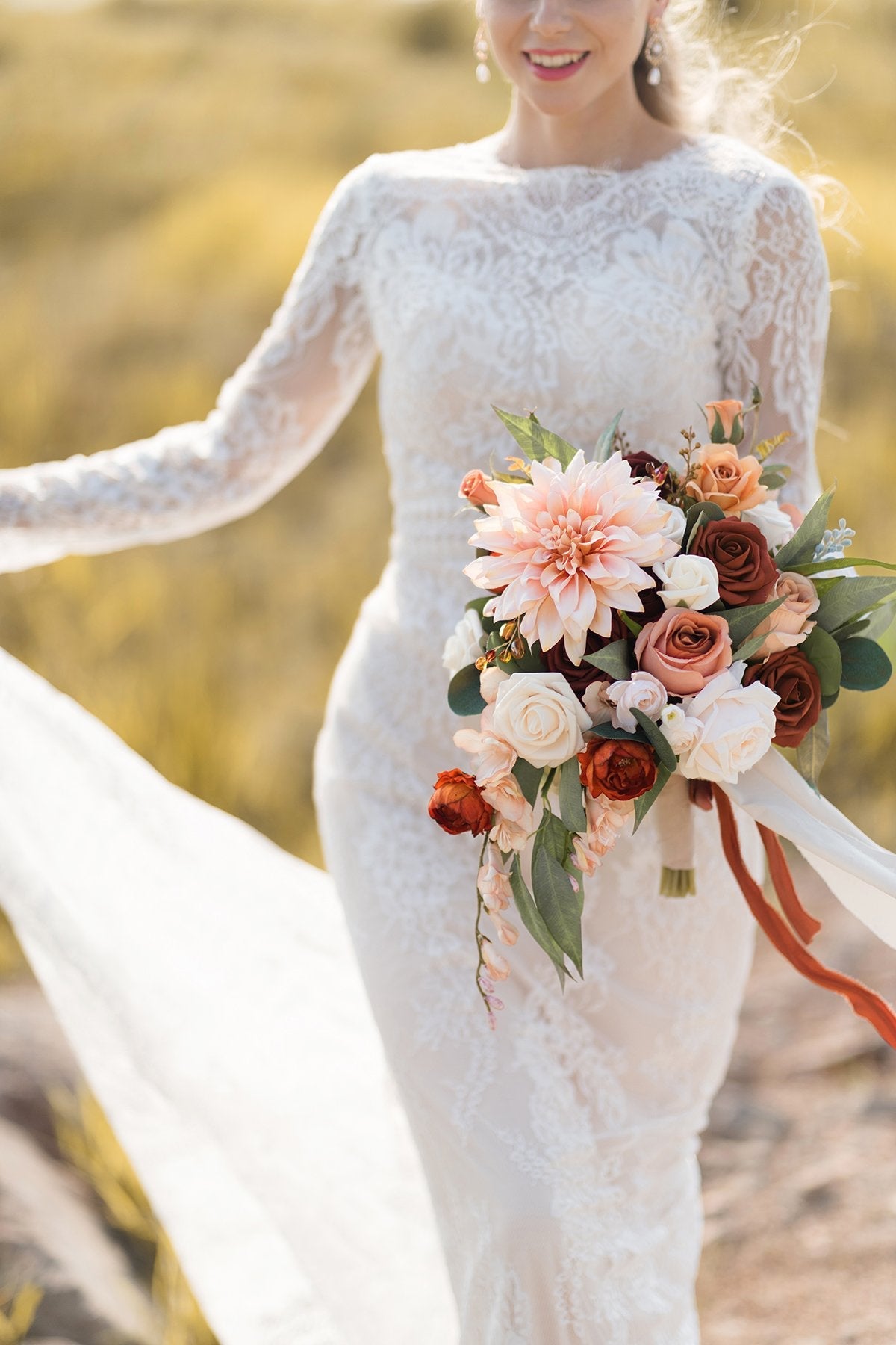 - Package: A 11" bridal bouquet with 2 chiffon ribbons (approx. 60" long . 1" wide) including 1 nude and 1 terracotta. Easy to add your ribbon knotting ideas.